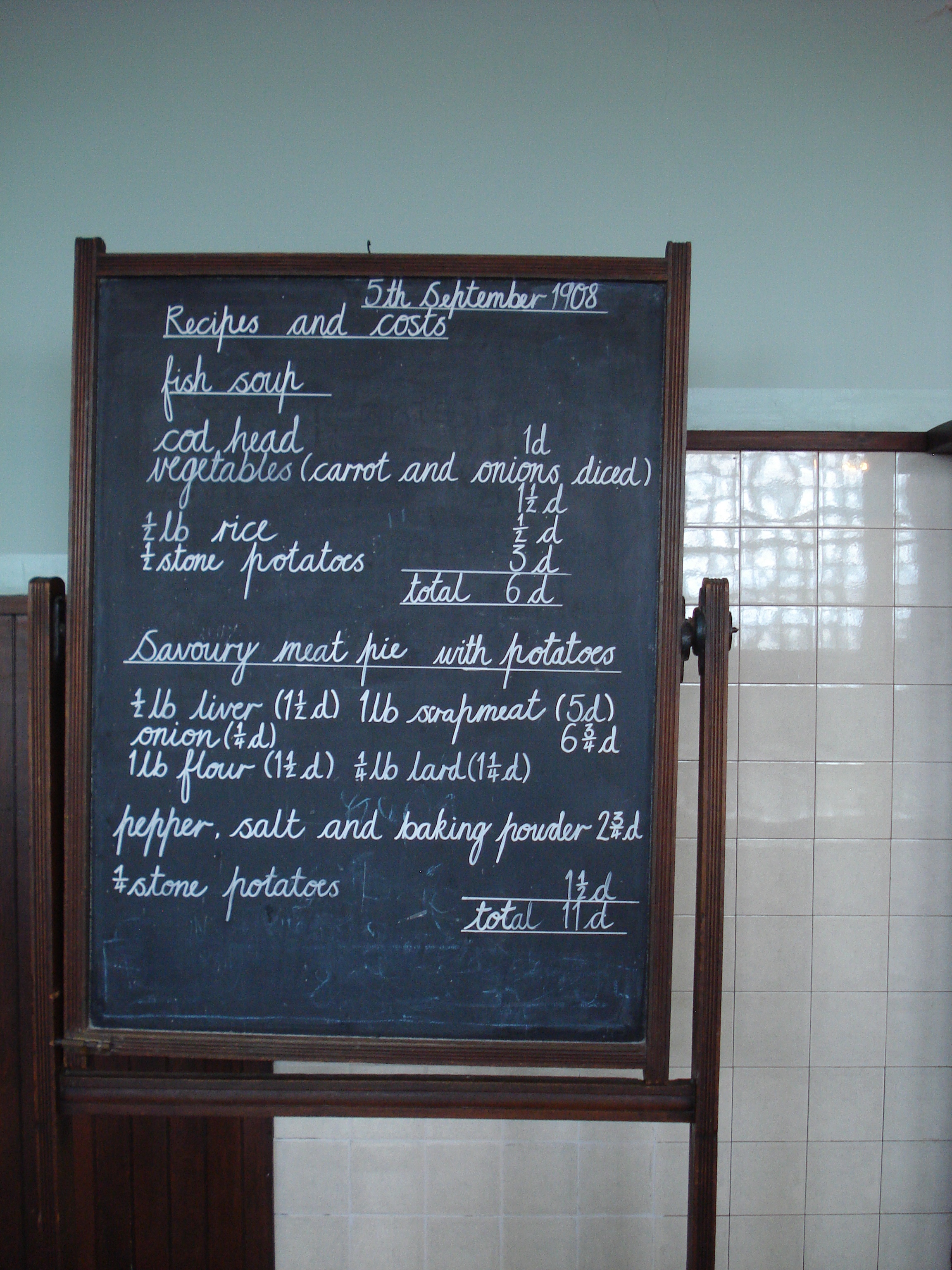 The largest classroom was devoted to Domestic Science, clearly more important for girls then than French, Latin, Algebra and Geometry. It has a huge polished range, capacious Belfast sinks and a mangle for washdays. There are three large benches with rolling pins and baking boards at the ready. We lingered over the blackboard with the recipe but were not tempted by the fish soup or the savoury meat pie.