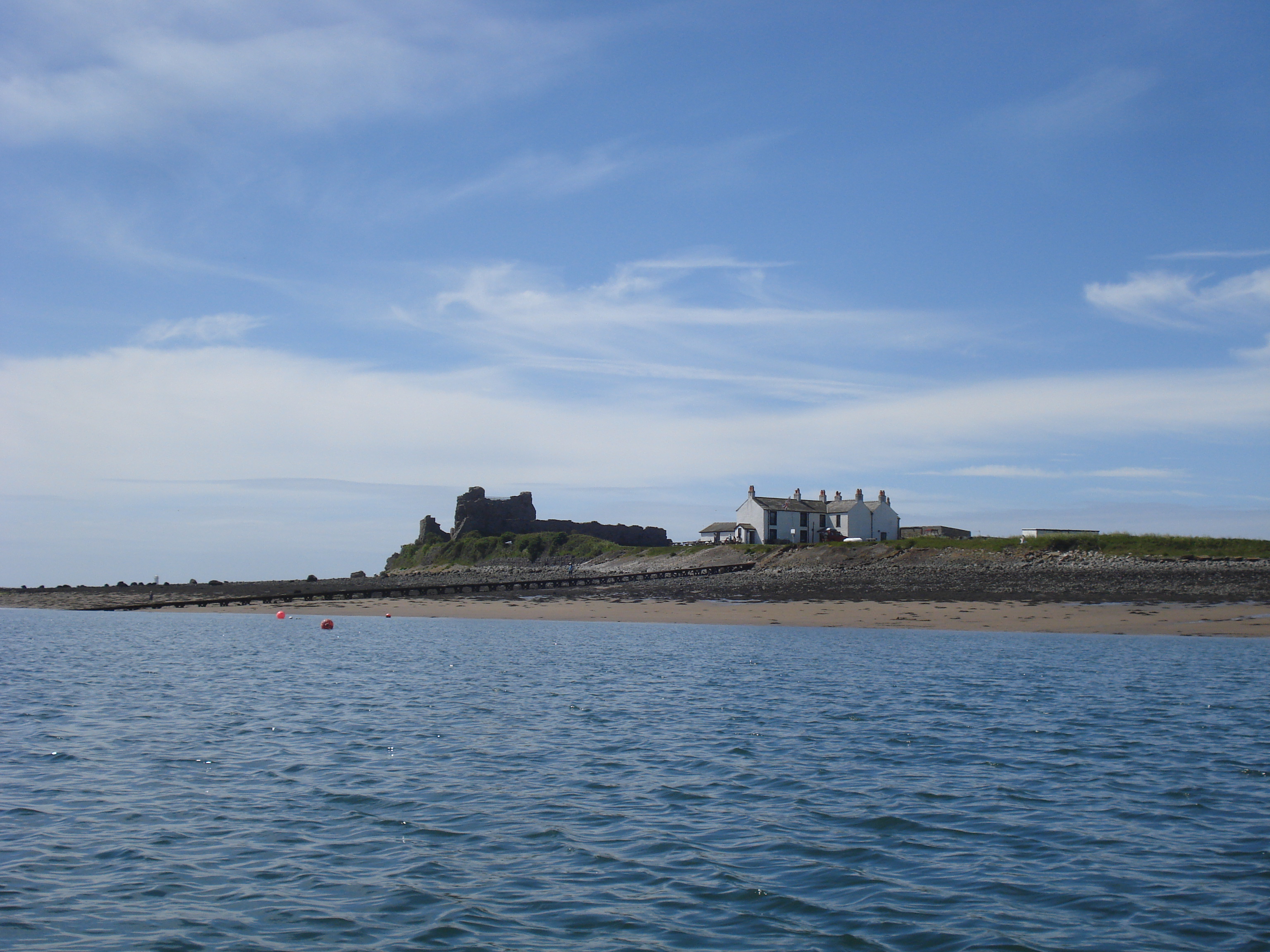 Barrow is one of these nearby places I rarely visit ; at the end of a peninsula on the road to nowhere except the sea, there isn’t often a reason. But the poetry workshop spurred me on, as did reading up about this unique island which has its own castle, king and knights as well as a pub that serves good chips. It guards the southern entrance to the channel between Walney Island and Barrow, the bulk of its castle visible for miles across the sands. You access the island by ferry from Roa Island, which is reached by causeway from the mainland.  We arrived at low tide. They’ve just built a new pier, but unfortunately they didn’t build it long enough. This meant that our 10.30 departure didn’t leave till the waves started lapping the pier end at 11.15. However, this was no hardship as we just turned to the sun and took in the enticing views of our destination.